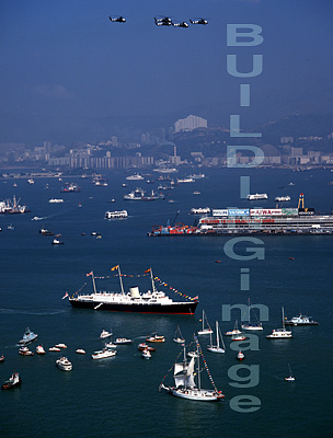Description: Royal Air Force helicopters fly over Royal Yacht Britannia in Victoria harbour, during the Queen's last ever visit to British Hong Kong in 1986; © Christopher Lee Marsh